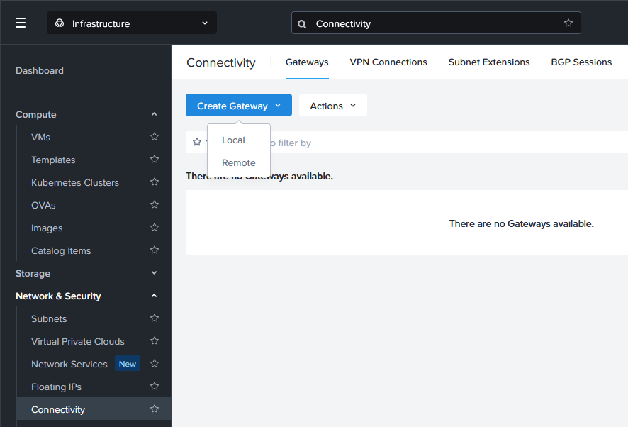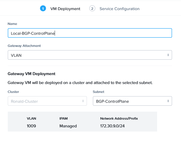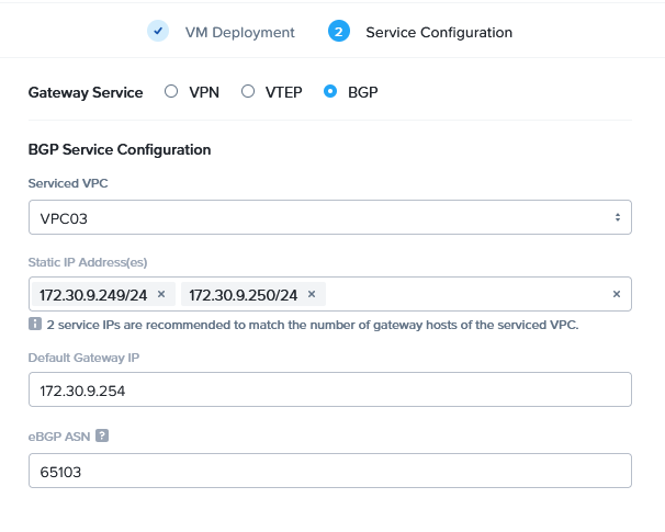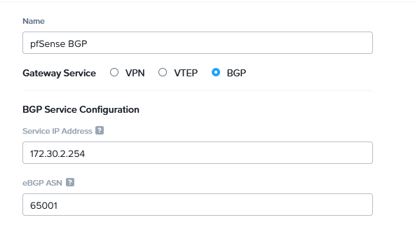 And then we specify we are creating a BGP Gateway Service (as opposed to a VPN or VTEP).