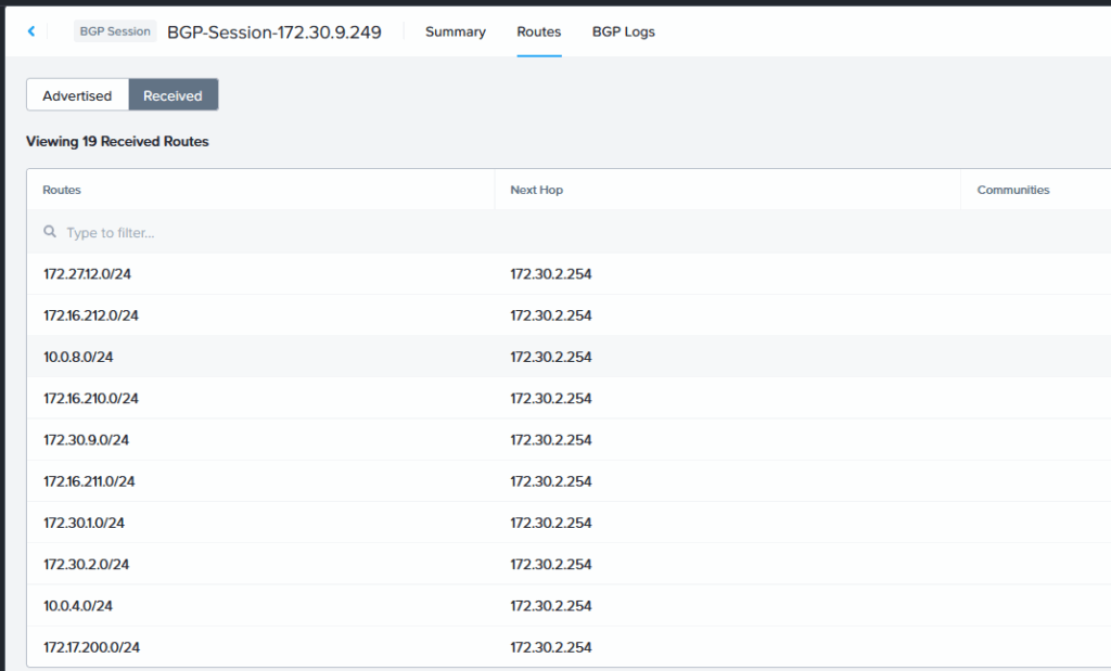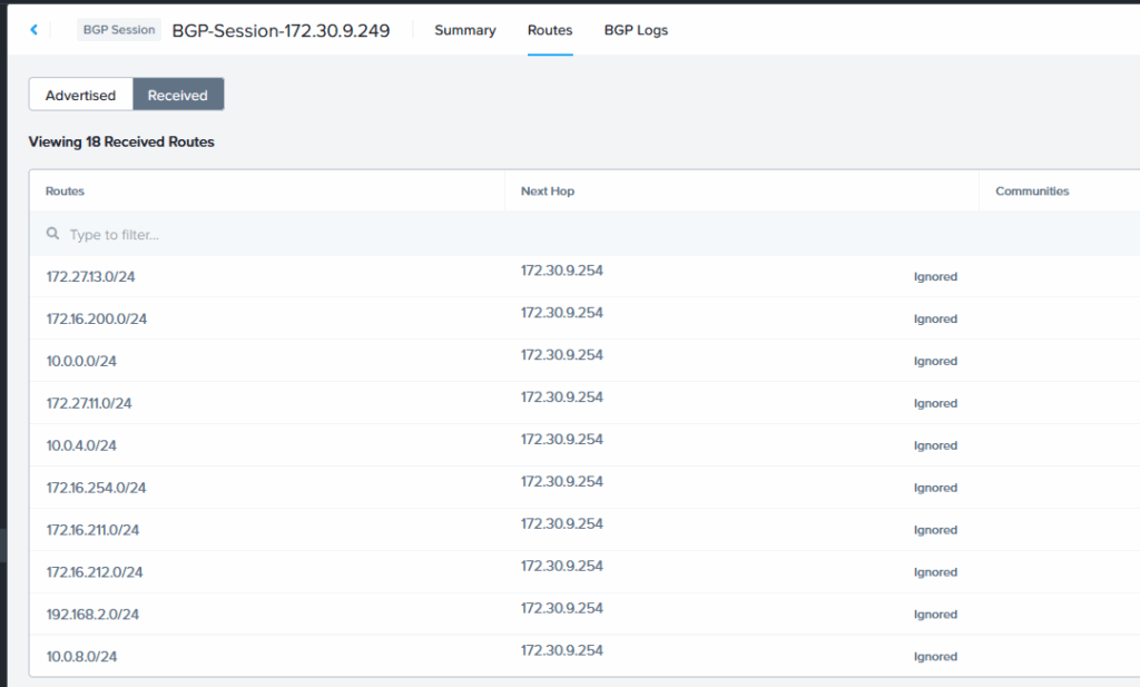 If that is left to the “Default” setting, the routes that will be advertised to the FVN environment, will have a next hop of (in my case) 172.30.9.254 instead of 172.30.2.254. The consequence of this would be that the routes that are received by the gateway within FVN will be ignored, because the subnet that is used for the external connectivity is on the 172.30.2.0/24 network: