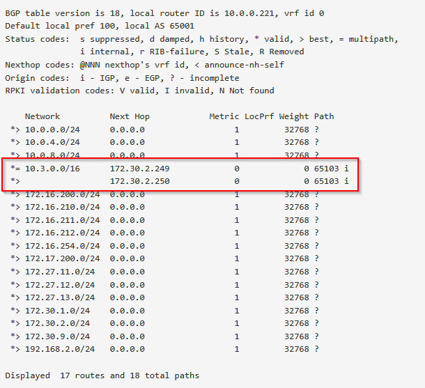 After changing the setting within the pfSense, the routes get added to the routing and forwarding table (note that the Next hop now is on the 172.30.2.0/24 network instead of the 172.30.9.0/24 network):