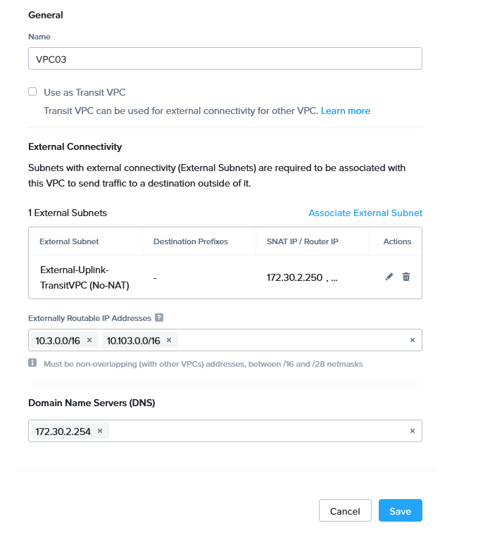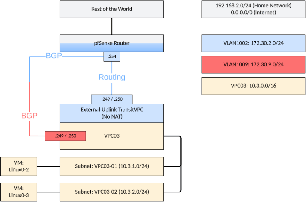 it is not automatically added to the routing table of the pfSense. It is not advertised by FVN. When I want to have that subnet advertised as well, I need to add it to the VPC03’s list of Externally Routable IP Addresses: