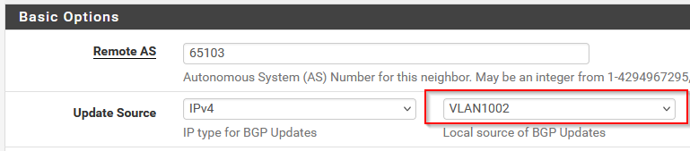 Another important thing to note, is that the IP Address that is used for the BGP connection, from within the pfSense is changed to the address that is part of the dataplane (as explained earlier):