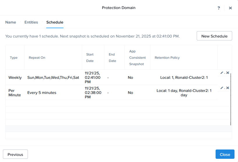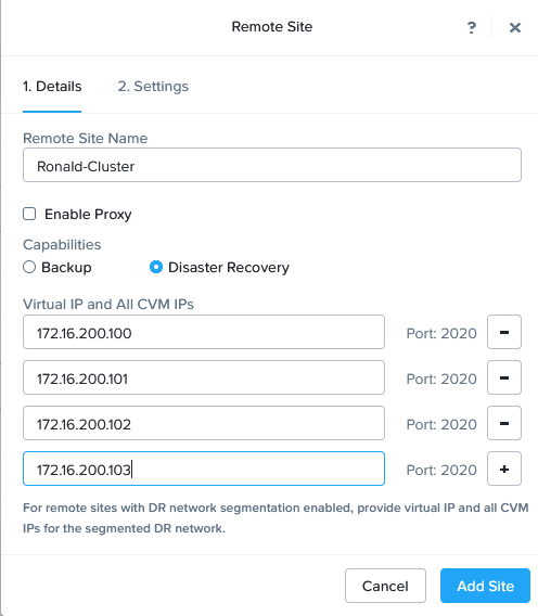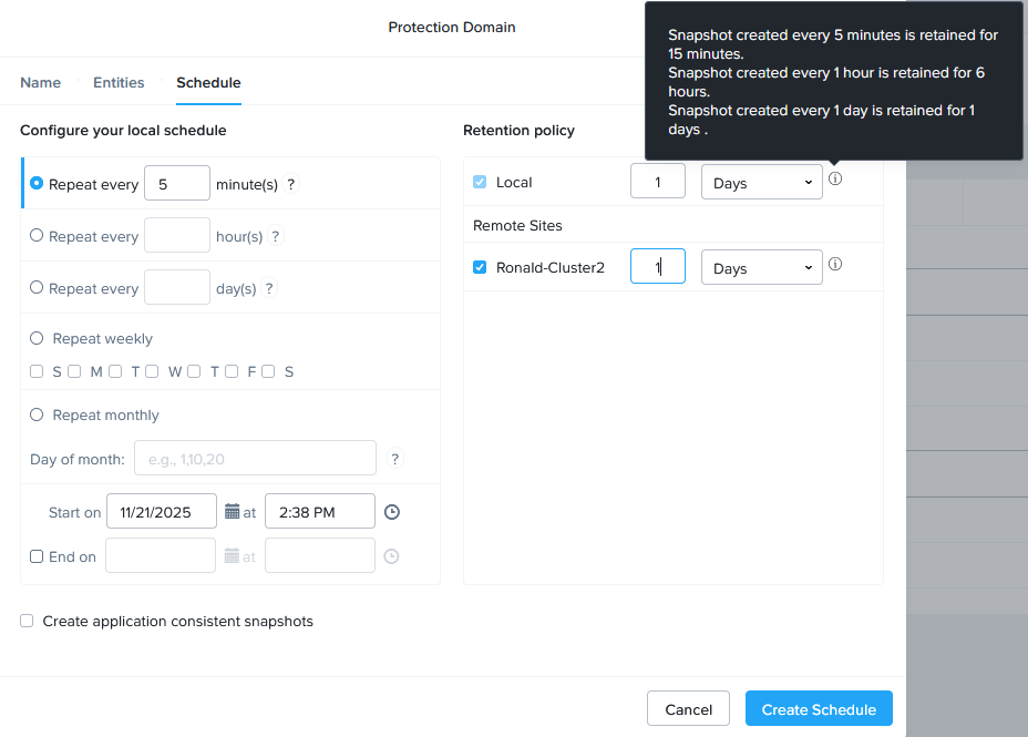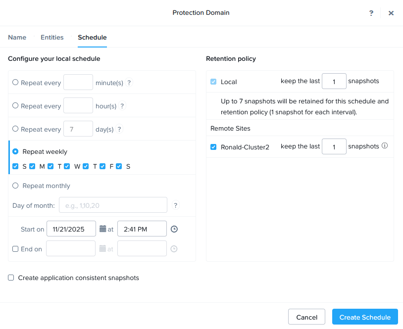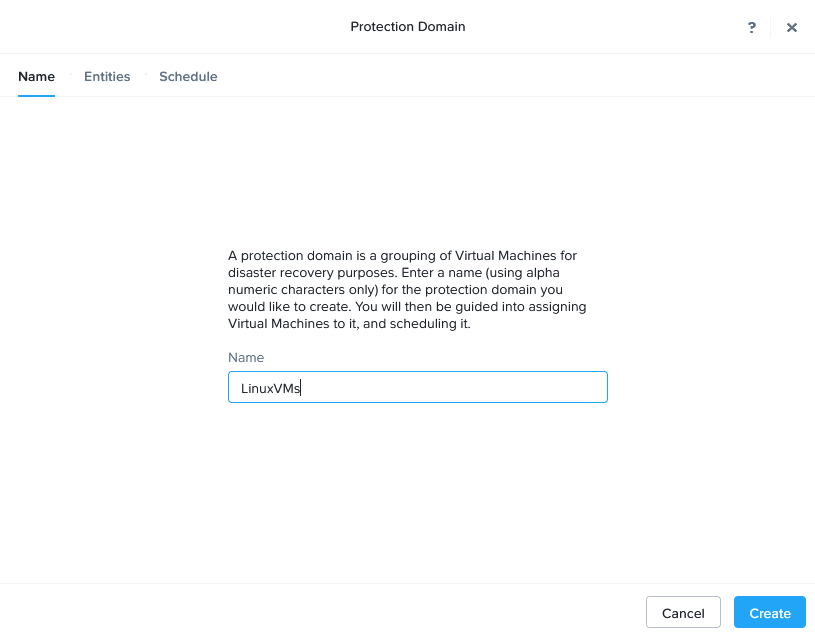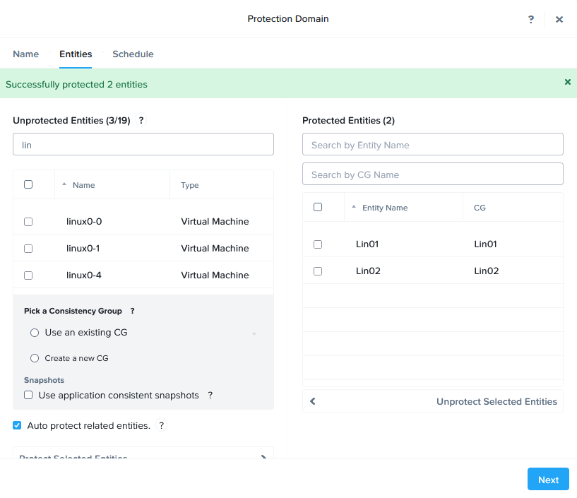 After the Remote Sites have been set-up, I can create a “Protection Domain”, that contains the Linux VMs: