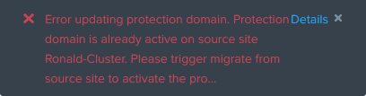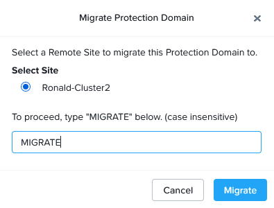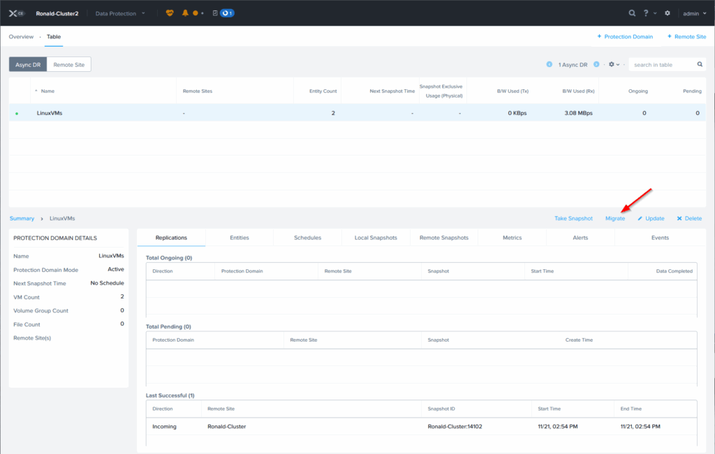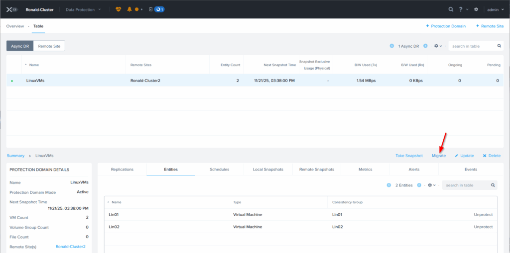 After all the activities have been performed, to protect the VMs, we can now failover a VM. We can do that on the originating cluster, when that is available, by clicking “Migrate”: