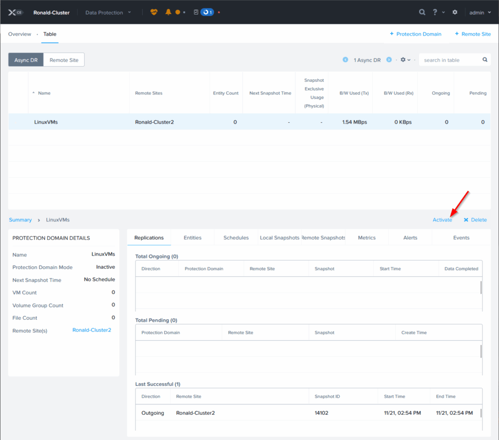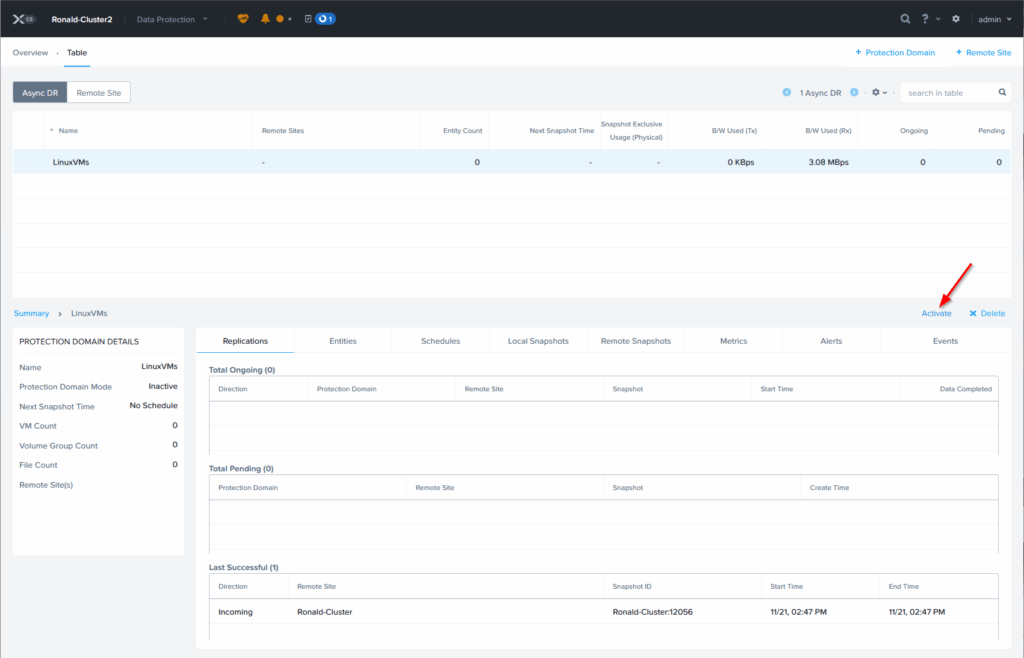 If the cluster is no longer available, I would be able to do the recovery from the remote site. Then it is done through the option “Activate”: