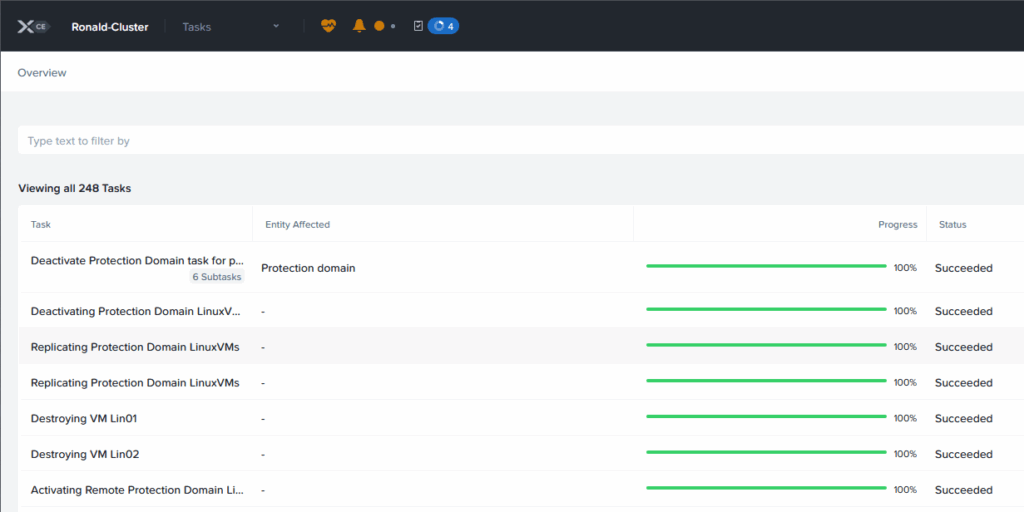 The VMs will be migrated to the target cluster. We can see the tasks running on the source cluster: