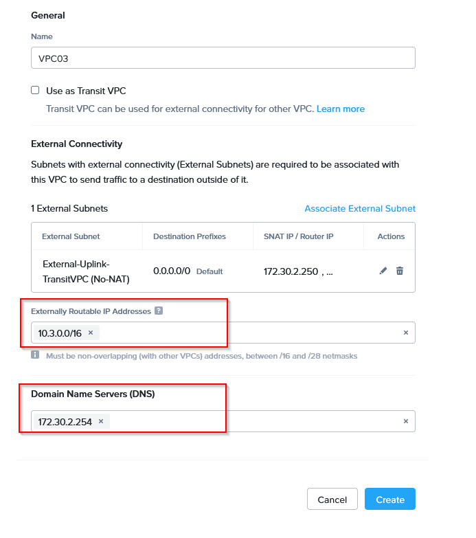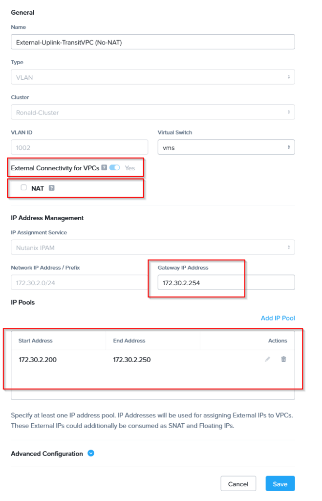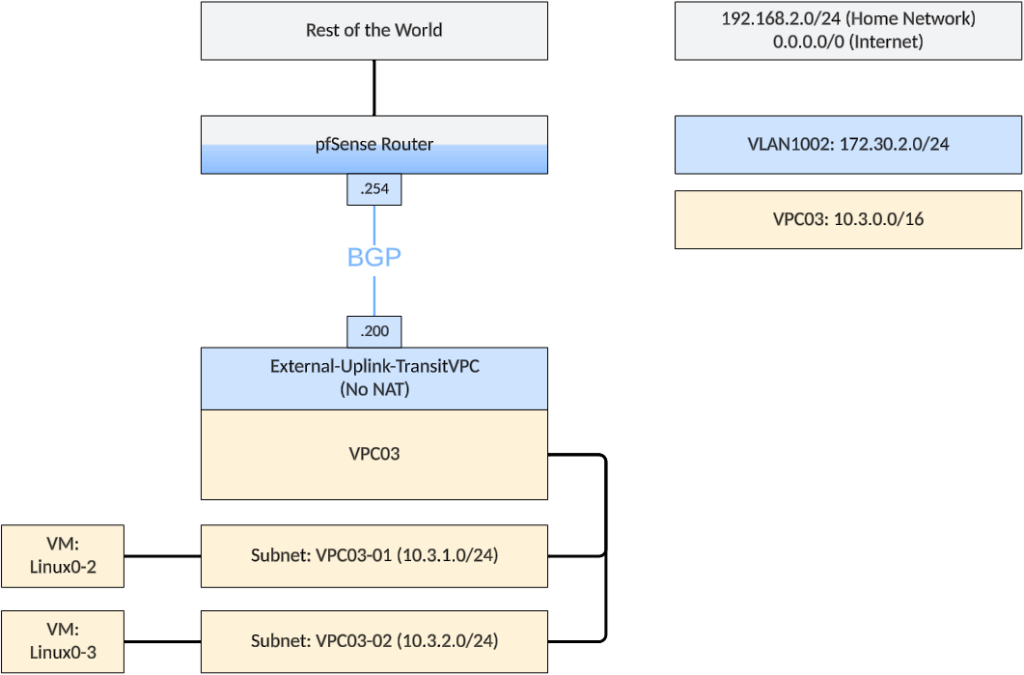 - External Connectivity for VPCs is enabled. This makes sure I can connect a VPC to it, and have it connect to my pfSense through this subnet/vlan.