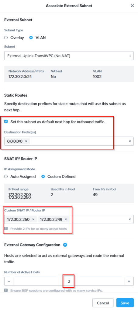 Also, I have manually chosen two IP Addresses (inside of the IP Pool) to be assigned to as many hosts. The number of hosts is configurable. These hosts (and IP Addresses) are used for forwarding traffic. If I had chosen three or four hosts, I would have to fill in three or four addresses (or chose to have that be assigned from the IP Pool). Since I am planning to use BGP, I thought knowing the addresses that will be used, will have it’s benefits…