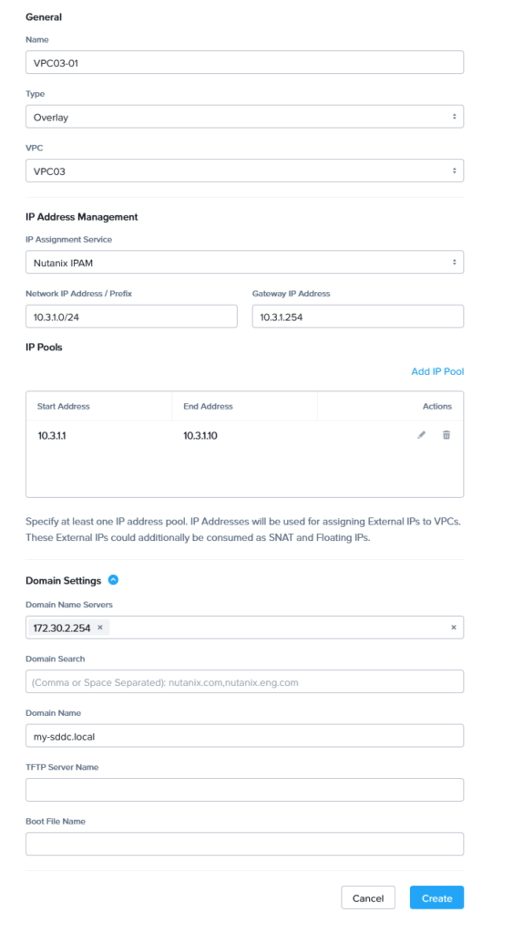 - IP Pools. I created an IP Pool that can be used for creating components in the VPC’s that I will connect to this subnet.