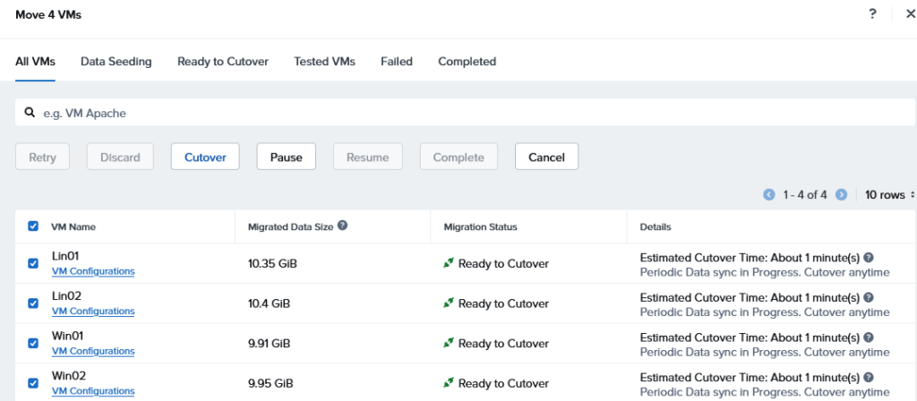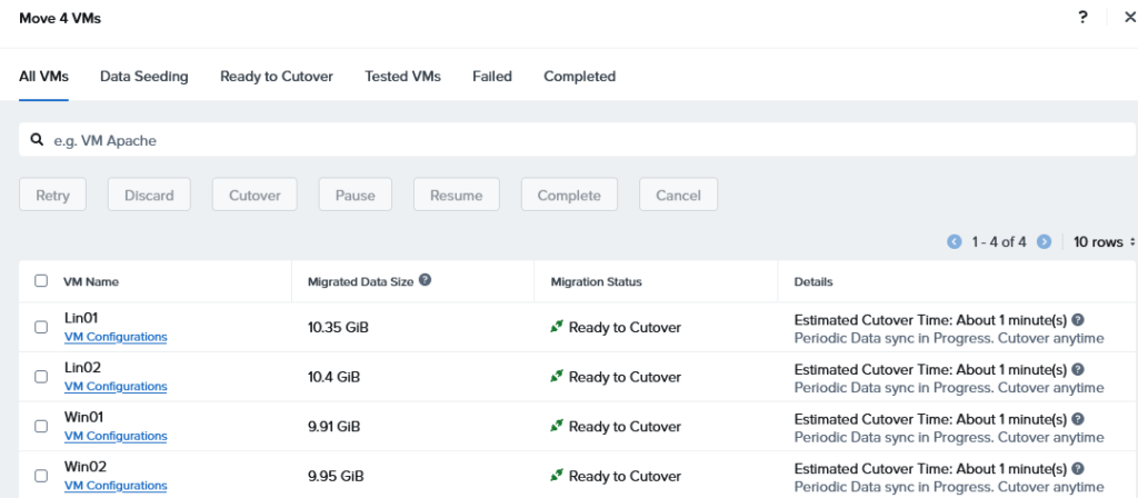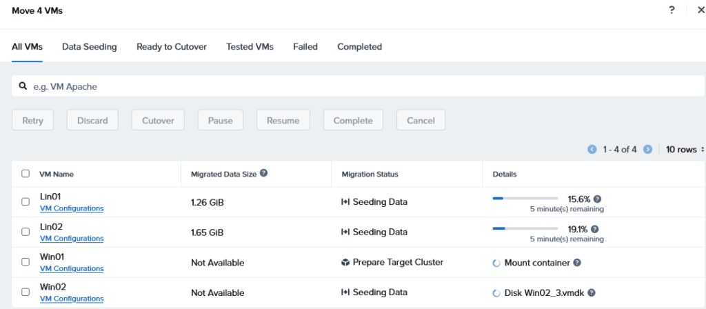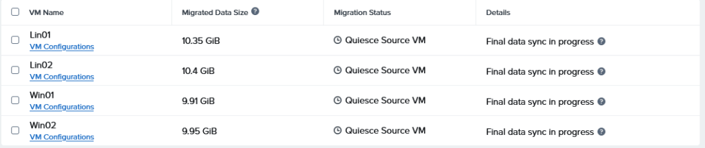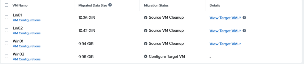 In the tabs on the top, we can select the different statusses of the VMs migrating. When all data has been migrated, the status will change to: