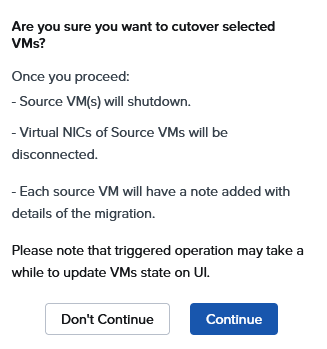 And when we click “Continue”, the actual cutover takes place. It shows what is happening: