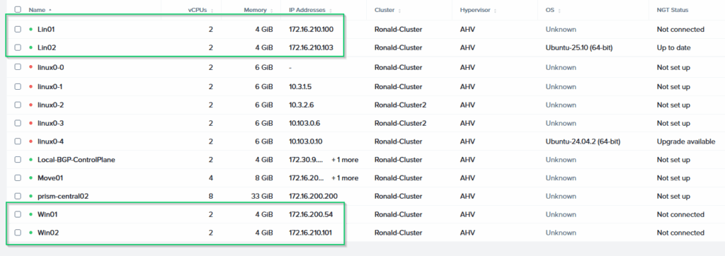 The VM’s are running VMware Tools and not a lot apart from that. But for this test, that should suffice. They are all connected to VLAN200 or 210 (one VM per OS per VLAN), which are also available in my Nutanix environment.