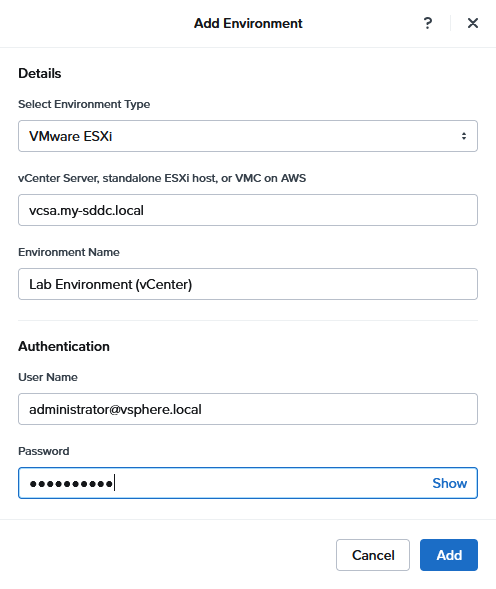 We are starting with the first environment, that will be the Source. I am connecting it to my vCenter Server that is hosting my lab environment: