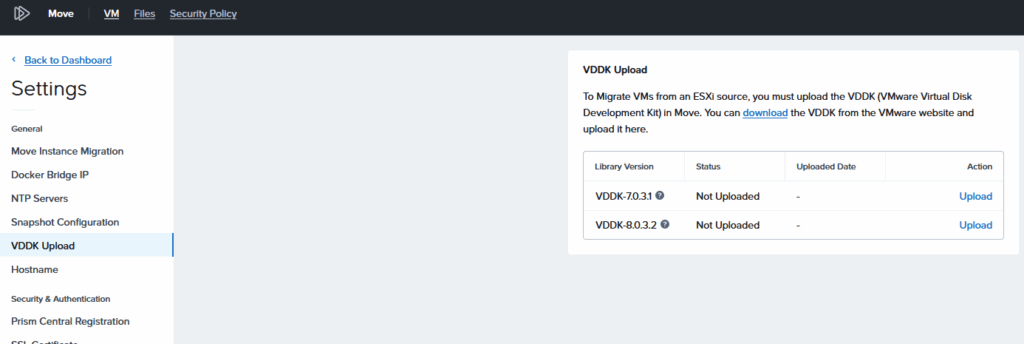 This is necessary to migrate VM’s from an ESXi source. So we click on the link and select the VDDK we need (in our case, we have an 8.x environment, so we choose the second one):