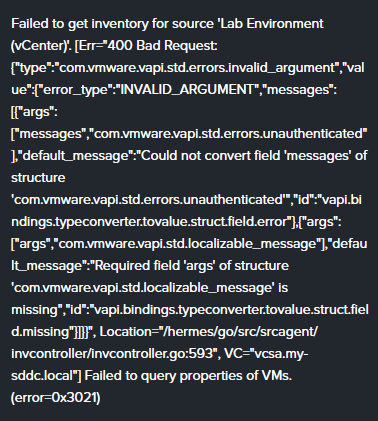 It did take some effort to get the inventory for the vCenter Server, because when I inventoried that server, I got an error message: