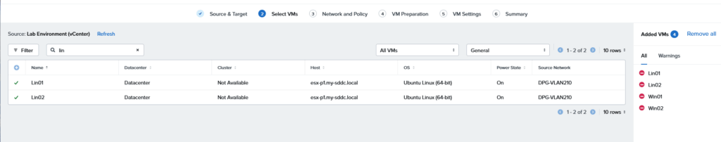 I select all the VM’s I want to migrate (you can filter on name and click “plus” to add the VM to the list):