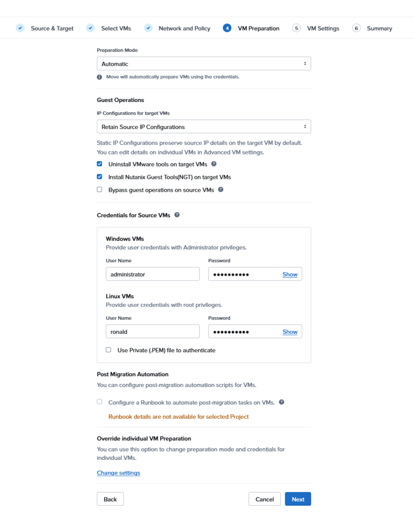 Then the VM’s have to prepared (this is still part of the process to create the Migration Plan):
