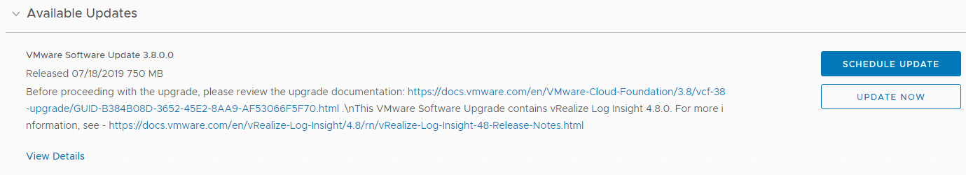 The next component in the upgrade process is the SDDC Manager itself. For this, we first need to download the correct bundle (it didn’t give me the option before). After this is done, the action is basically the same as previous. Click Update Now (or schedule your update for a later date or time) and go!