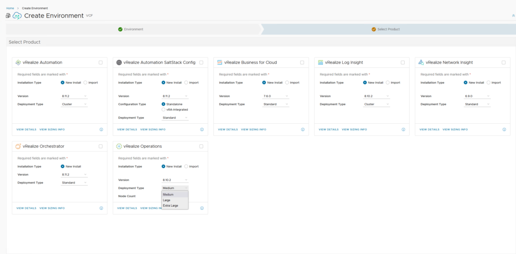 First I deployed Aria Suite LifeCycle Manager (although still called vRealize for that version): https://my-sddc.net/vcf-on-vcd-aria-vrealize-suite-lifecycle-manager/, then I deployed vIDM (https://my-sddc.net/vcf-on-vcd-vmware-identity-manager/), but if I now want to deploy additional components, we don’t get to choose the size, below a certain threshold. For instance, if I want to deploy Aria Automation (vRealize Automation), it’s minimum size is clustered. Aria Operations (vRealize Operations or vROPs) is minimum “Medium”: