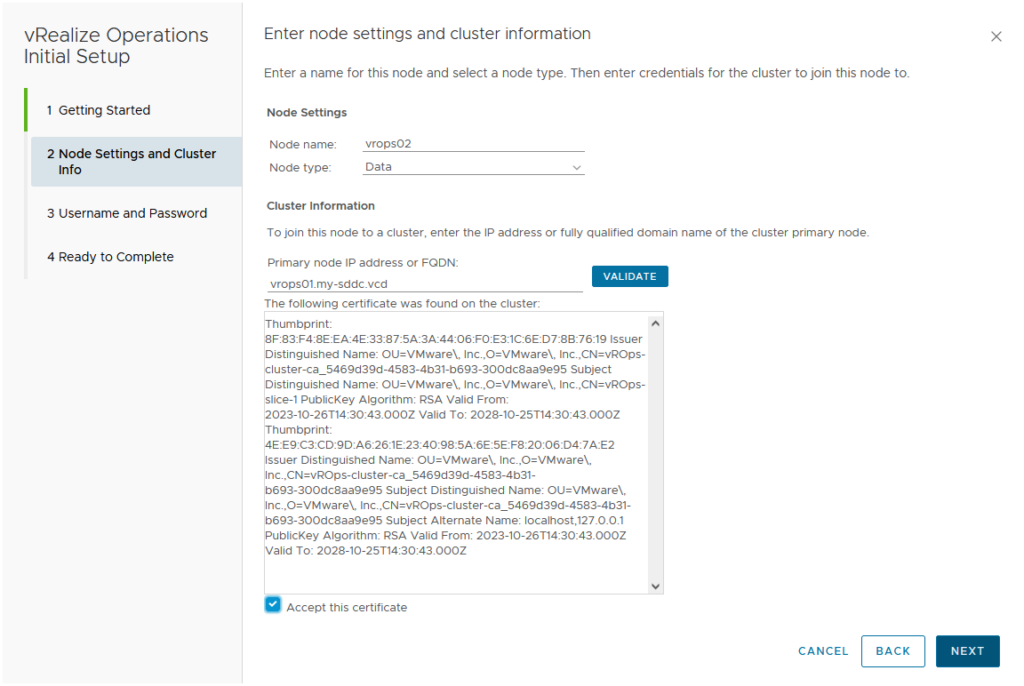 The second thing we need to do is all this again, but now, join a second vROPs appliance to our first, to create a cluster. After deploying the appliance, we expand an existing installation: