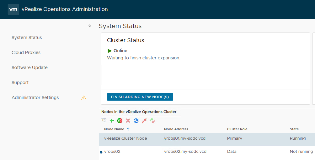 When it is done, the new node will show in the “System Status” screen, where we can Finish Adding New Node(s):