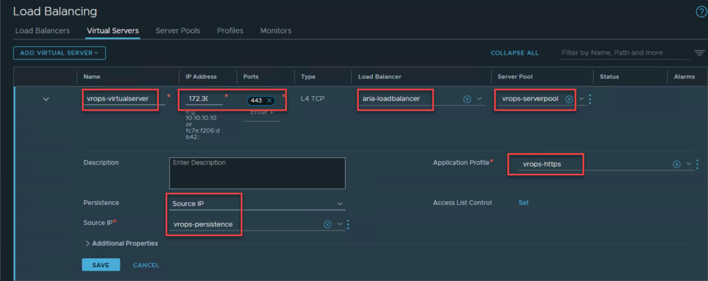 And finally the Virtual Servers. The first one contains the just created Server Pool and is connected to the earlier created loadbalancer. It also uses the created application profile and persistence profile. We also fill out the correct IP address (although that is not fully visible in this screenshot):