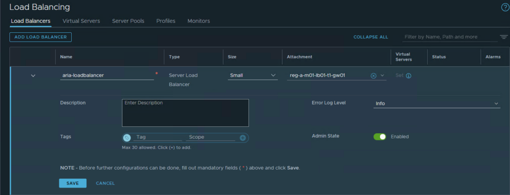 Next step is configuring a Load Balancer on NSX. For this we will be using the Tier-1 Gateway that was created as part of the deployment of ASLCM appliance (see https://my-sddc.net/vcf-on-vcd-aria-vrealize-suite-lifecycle-manager).