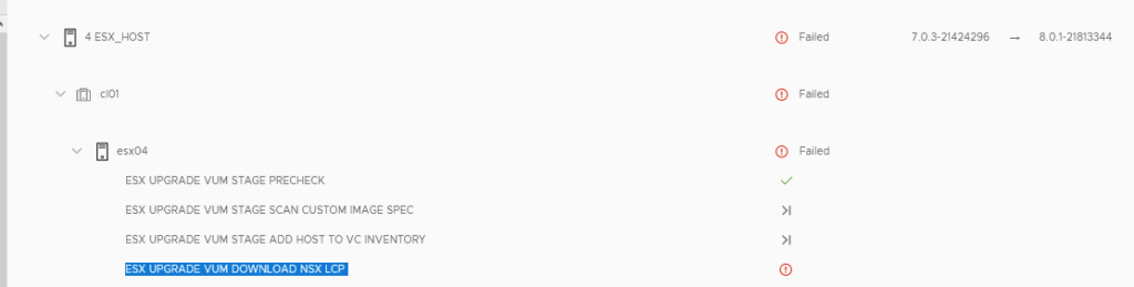 After this, the other hosts were upgraded, but I received a failure at the third host. There I got the message: