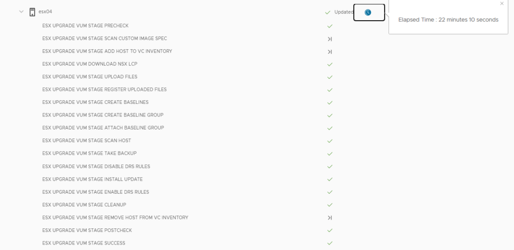 I retried the upgrade and this time it passed the NSX LCP part. And after roughly 22 minutes, the host completed: