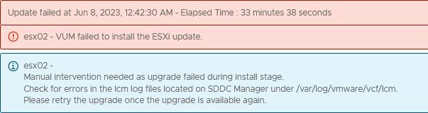 Manual intervention needed as upgrade failed during install stage. Check for errors in the lcm log files located on SDDC Manager under /var/log/vmware/vcf/lcm. Please retry the upgrade once the upgrade is available again.