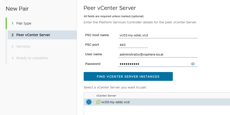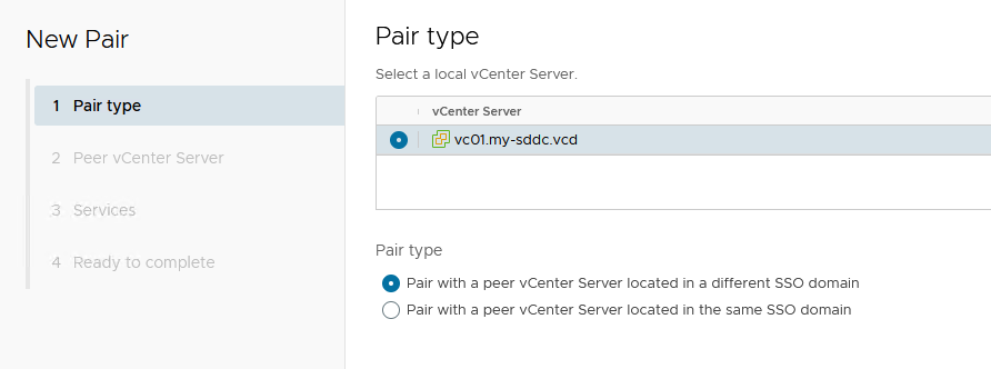 We are creating a pair with a vCenter Server located in a different SSO domain: