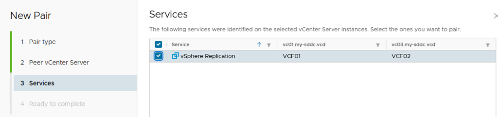 After deploying the second Replication appliance, to VCF02, we can pair the two. We do this two-way.