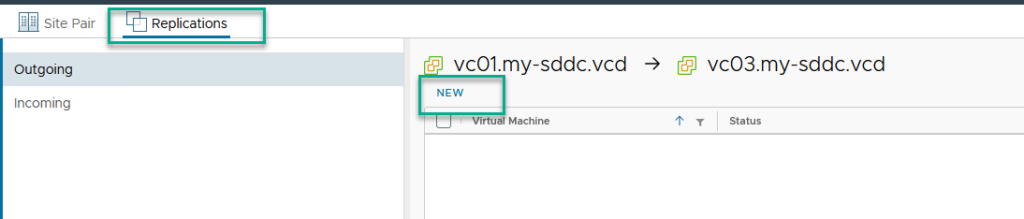 For this, we go to “Replications” and click “New”:
